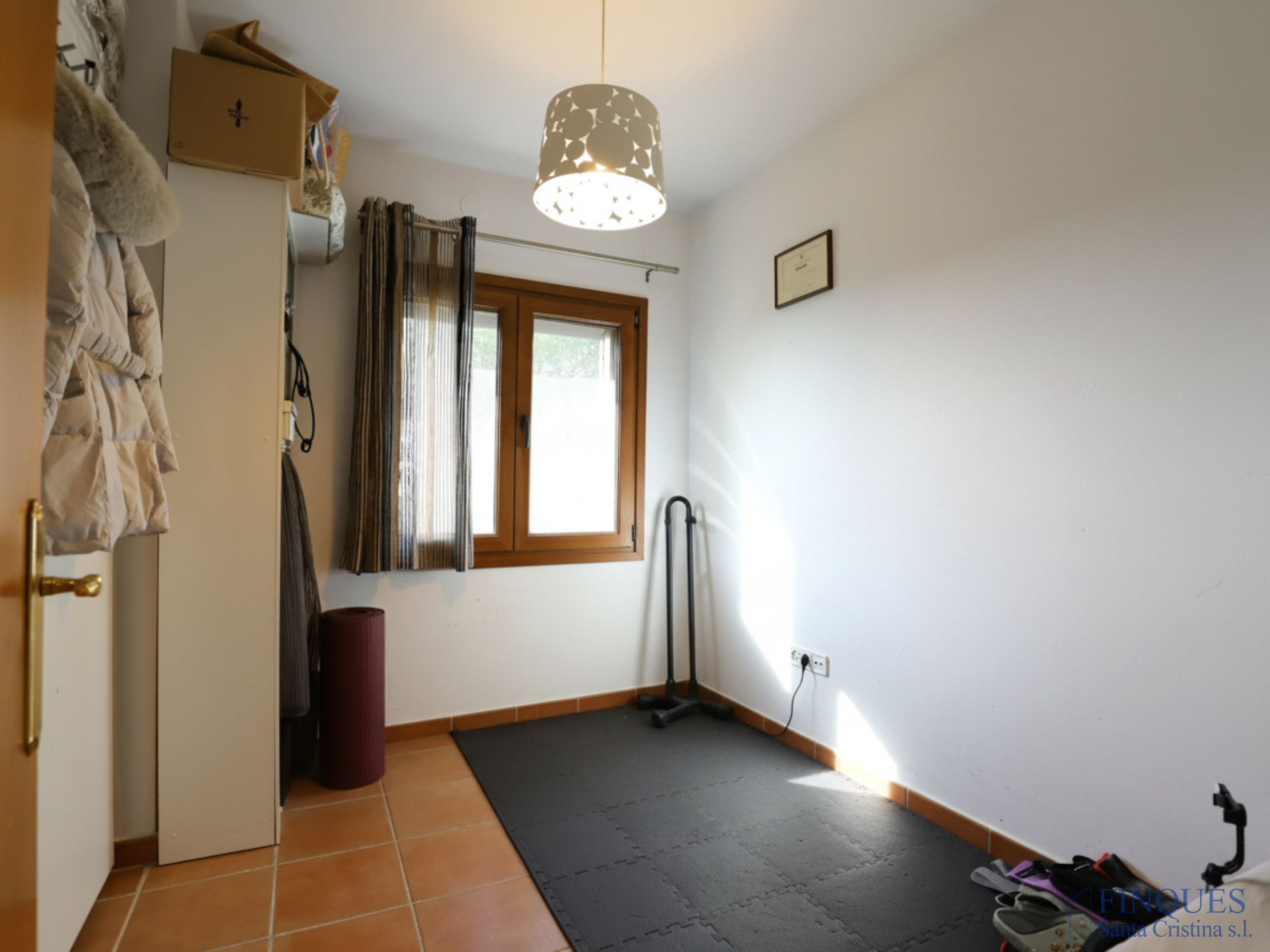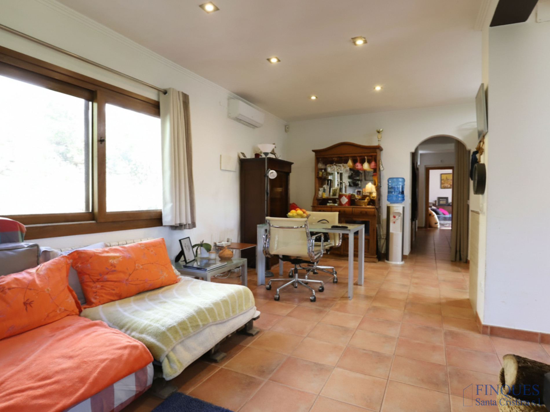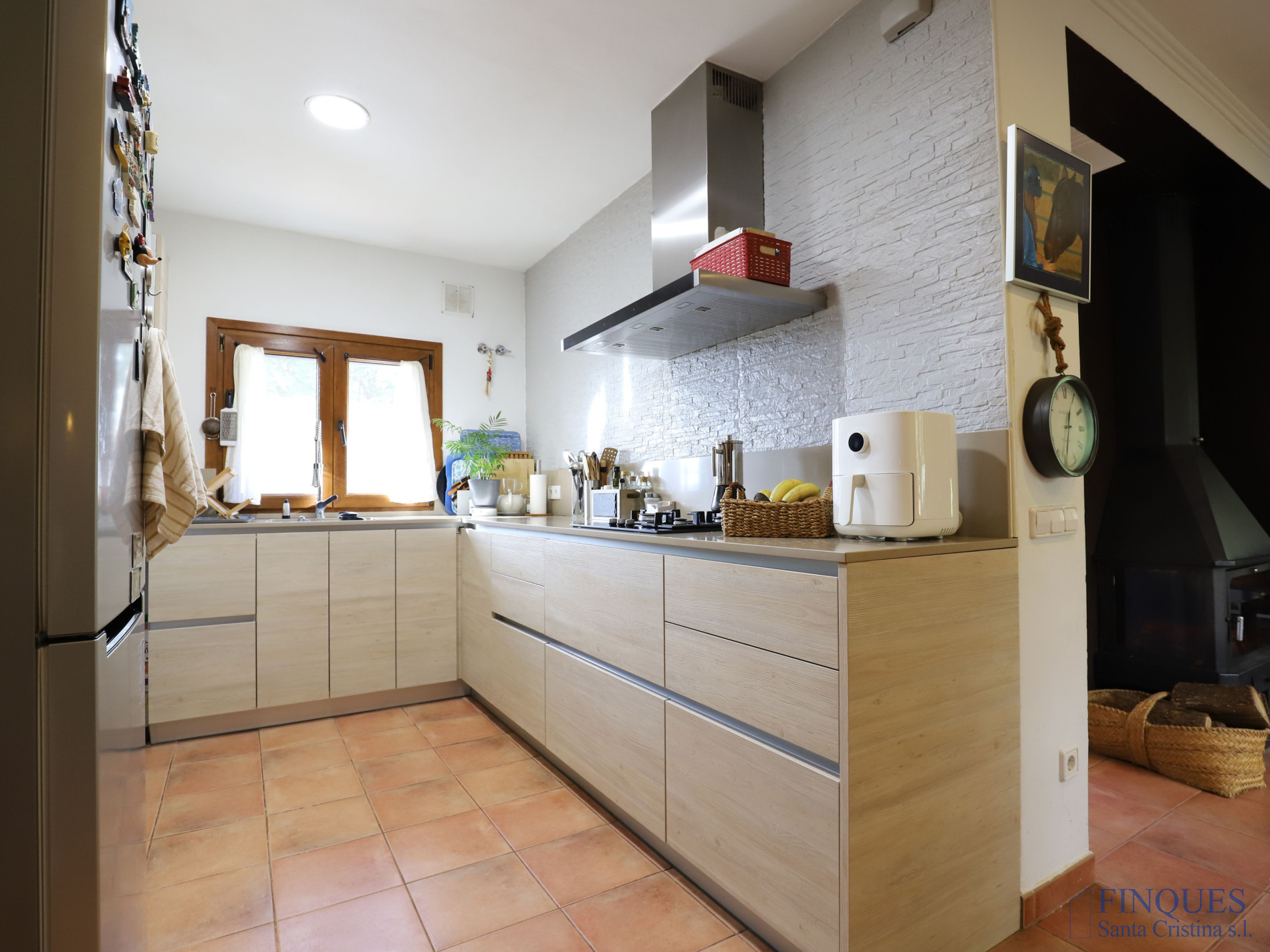 Santa Cristina d’Aro – Urbanització Sant Miquel d’Aro. Casa independent als quatre vents, situada en una tranquil·la zona residencial, sobre una àmplia parcel·la enjardinada de 1.526 m². Disposa de tres accessos: dues entrades per a vianants des de la part baixa de la finca i una entrada per a vehicles des de la part alta, que dona accés a un garatge de 57 m². L’habitatge es distribueix en una sola planta i compta amb rebedor, sala d’estar-menjador amb llar de foc i cuina oberta, passadís distribuïdor, tres dormitoris, un vestidor i dos banys complets. Equipada amb calefacció de gas, aire condicionat per splits amb bomba de fred i calor i tancaments de doble vidre.