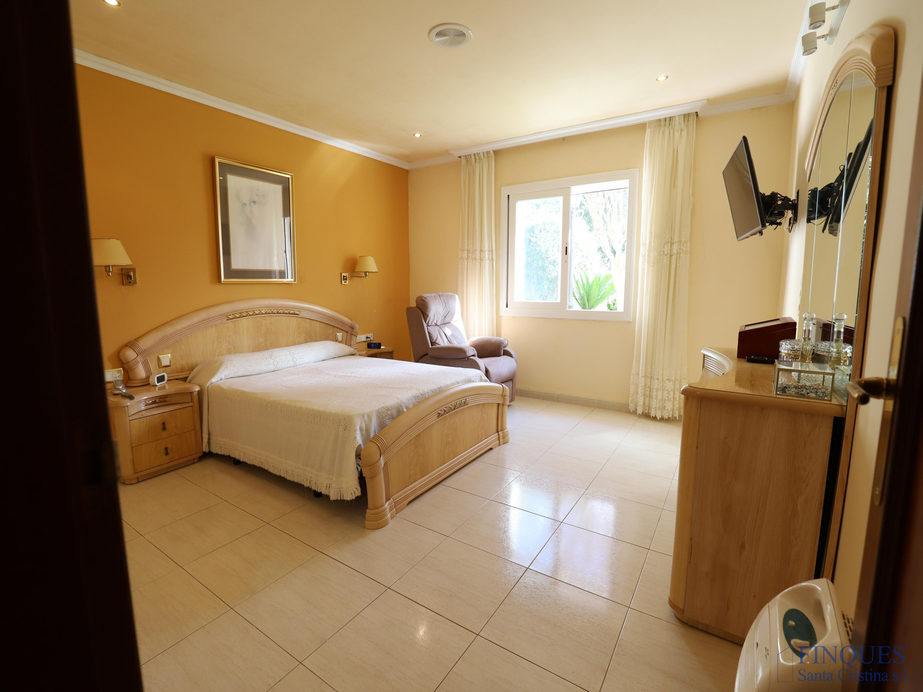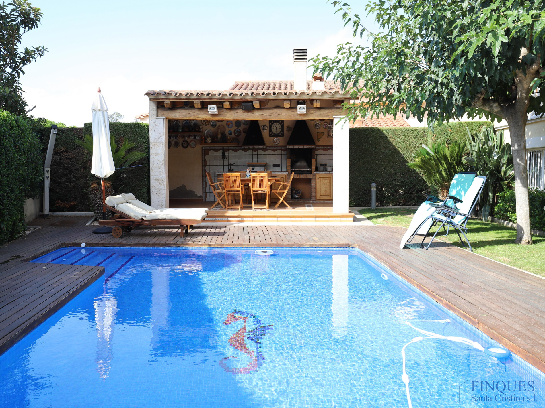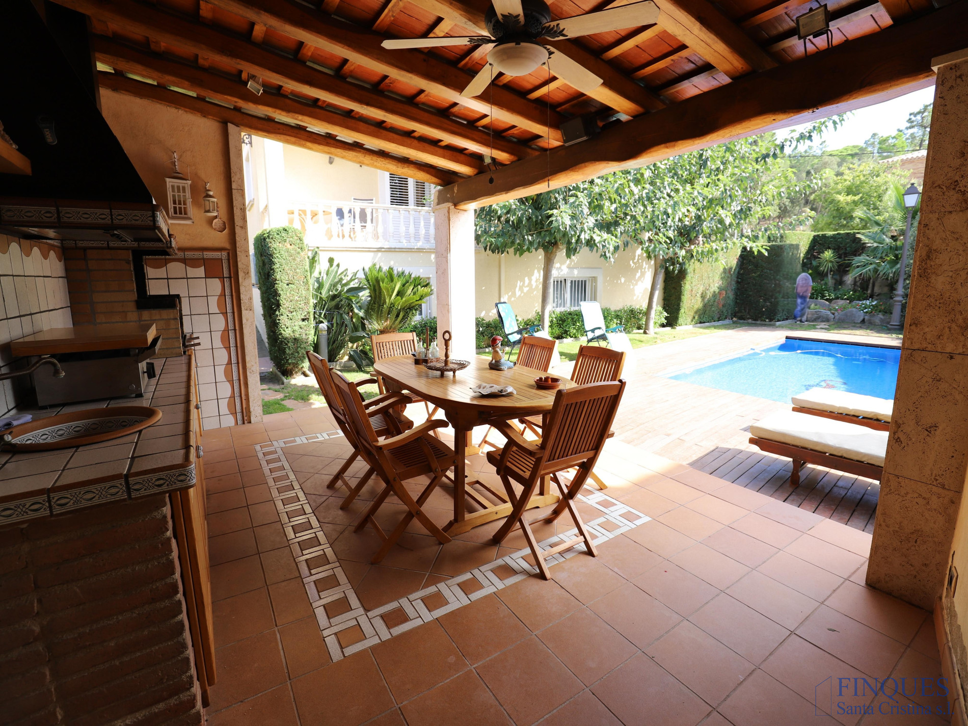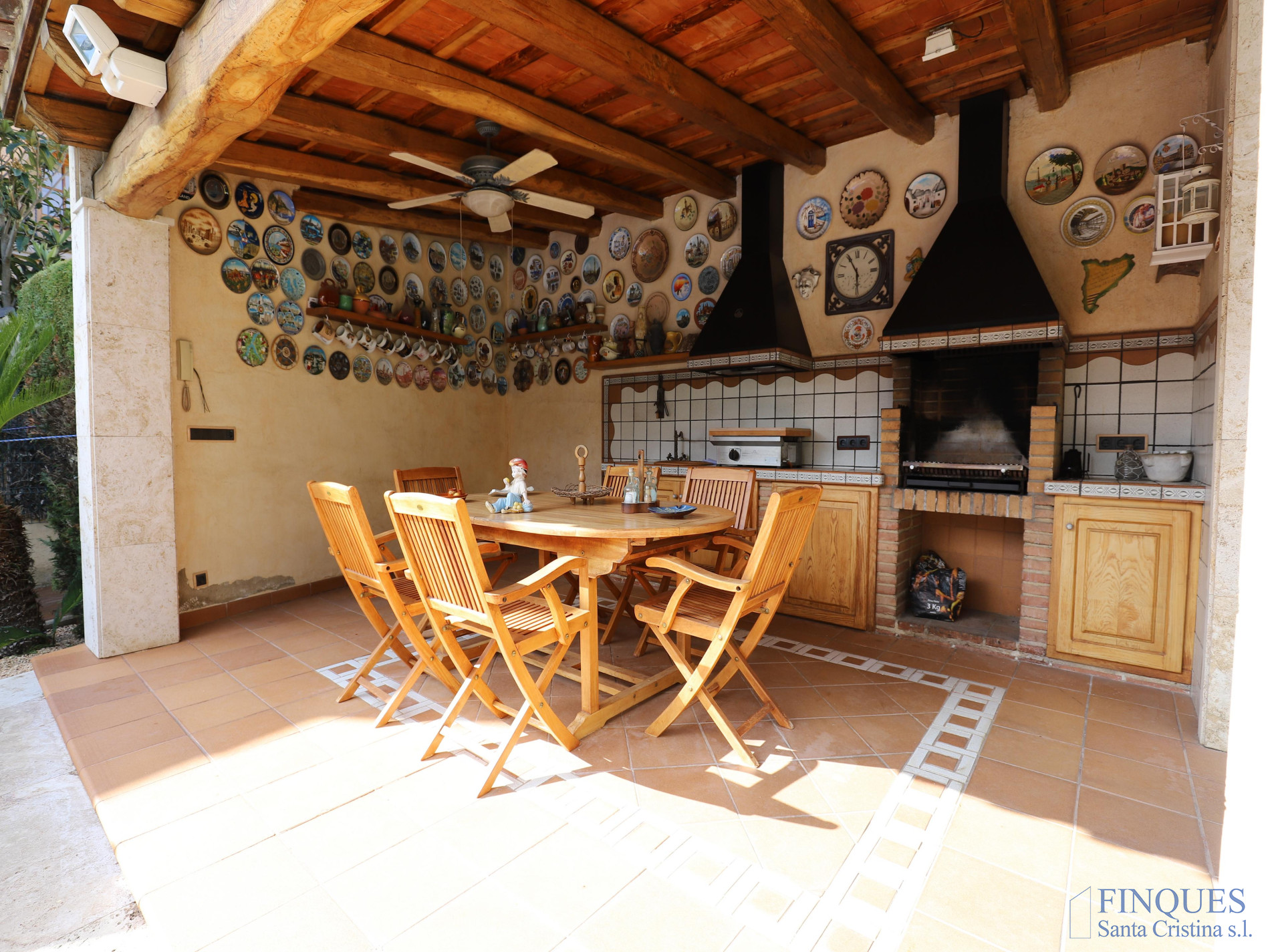 Santa Cristina d’Aro – Urbanización Mas Trempat. Casa toda en una sola planta principal, con planta sótano comunicada mediante escalera interior. La planta baja se distribuye en un amplio porche que da acceso al recibidor, salón-comedor y cocina independiente totalmente equipada, con chimenea y salida a un balcón y a la zona de lavandería. Dispone de cuatro habitaciones dobles, una de ellas tipo suite con vestidor y baño completo con bañera y ducha de hidromasaje, además de un segundo baño completo. En el exterior encontramos un jardín con piscina, porche con cocina de verano y barbacoa, y en la parte posterior, una zona habilitada como trastero. La planta sótano cuenta con un amplio garaje, sala de máquinas y baño completo. La vivienda está equipada con cierres de aluminio, calefacción de gasoil por suelo radiante y aire acondicionado mediante splits.