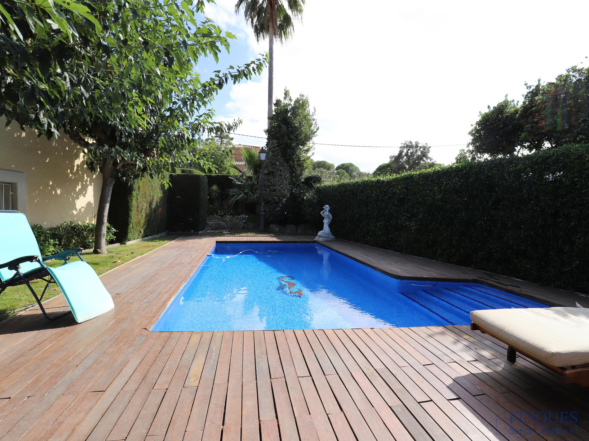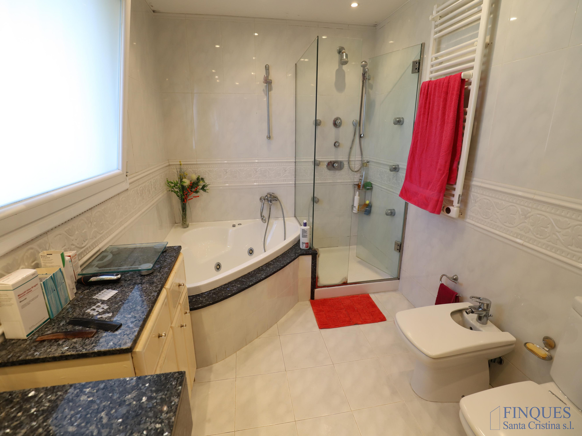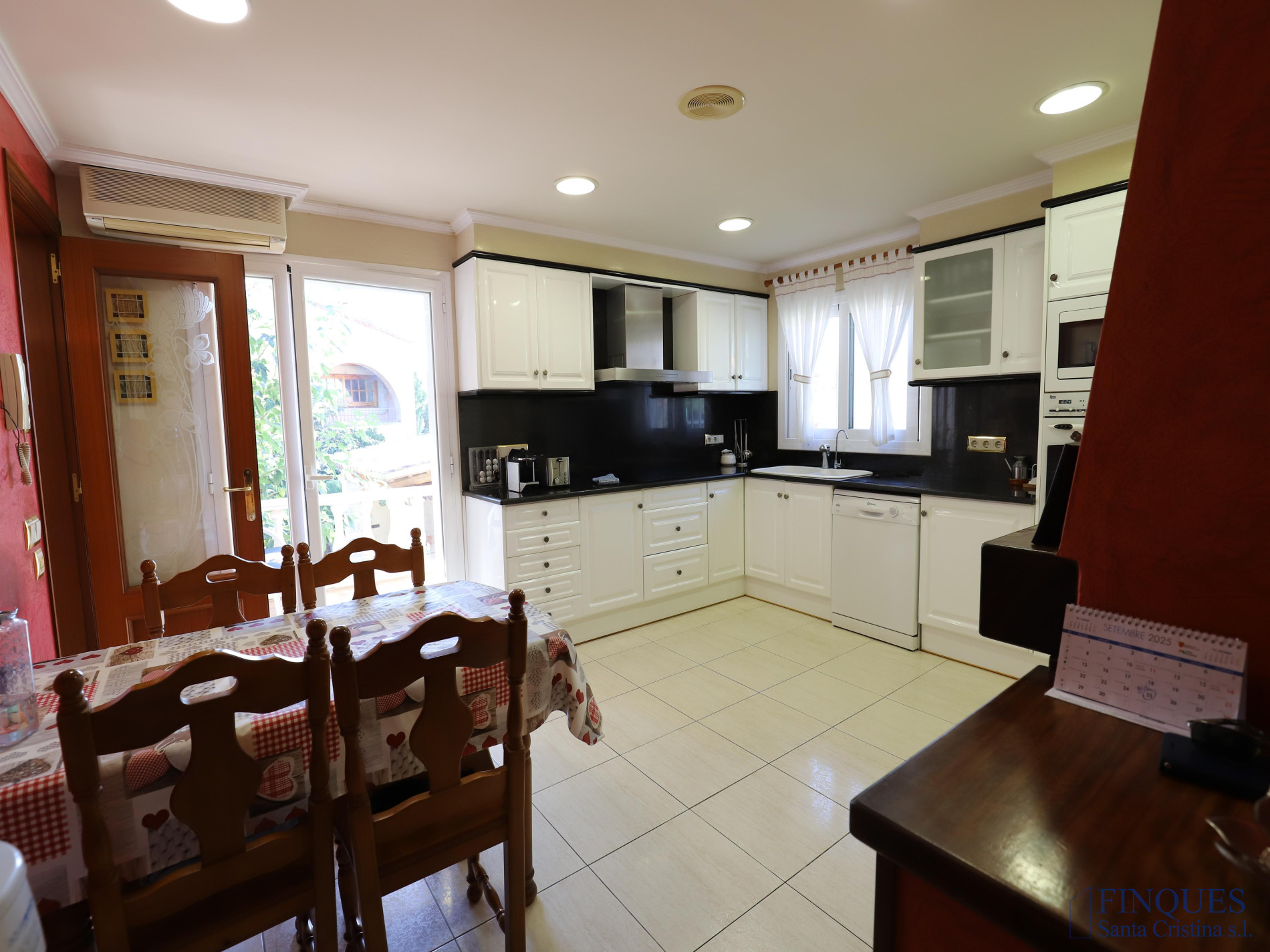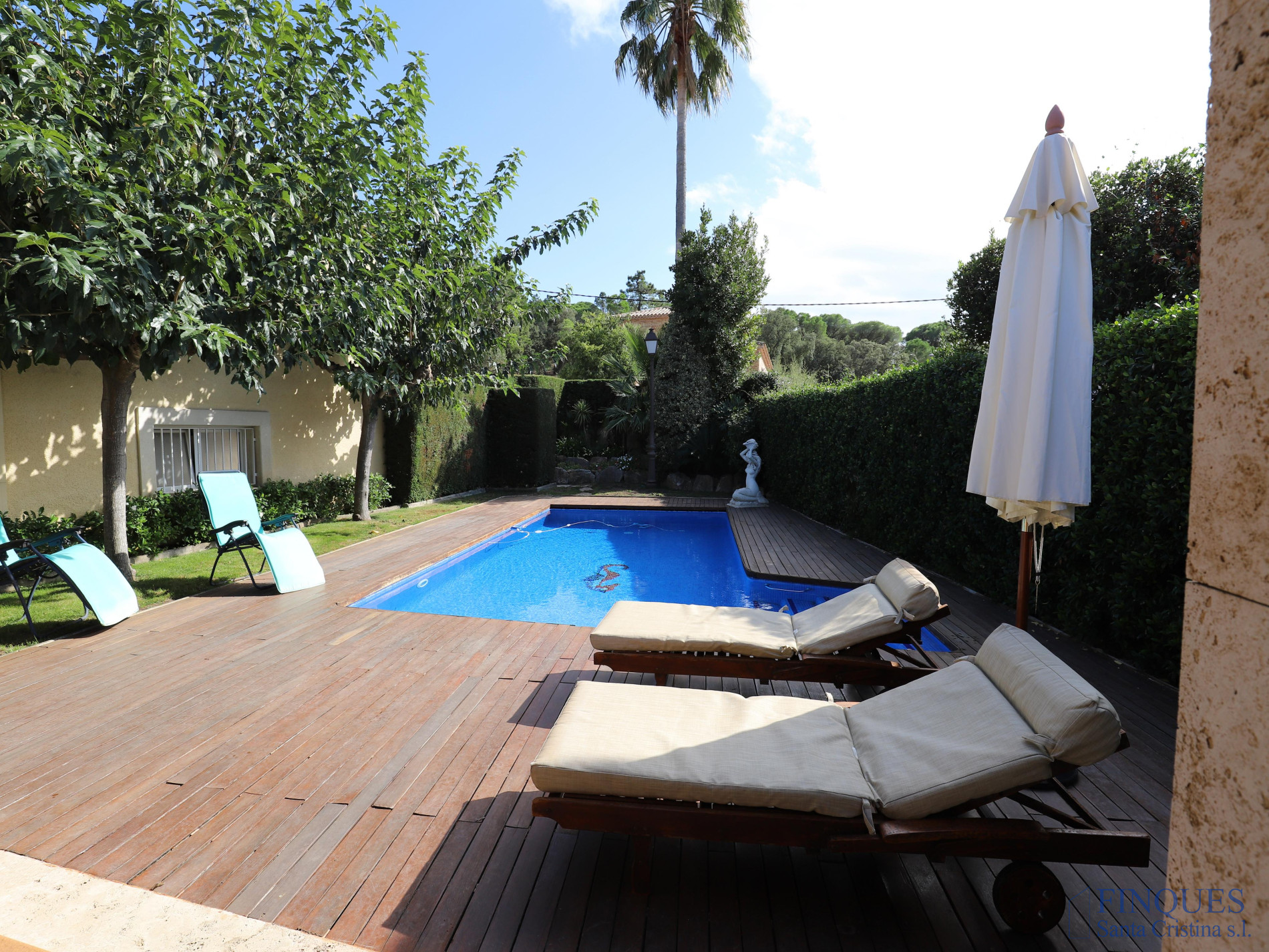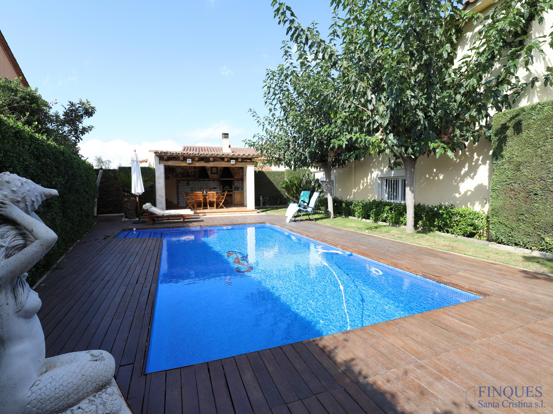 Santa Cristina d’Aro – Urbanización Mas Trempat. Casa toda en una sola planta principal, con planta sótano comunicada mediante escalera interior. La planta baja se distribuye en un amplio porche que da acceso al recibidor, salón-comedor y cocina independiente totalmente equipada, con chimenea y salida a un balcón y a la zona de lavandería. Dispone de cuatro habitaciones dobles, una de ellas tipo suite con vestidor y baño completo con bañera y ducha de hidromasaje, además de un segundo baño completo. En el exterior encontramos un jardín con piscina, porche con cocina de verano y barbacoa, y en la parte posterior, una zona habilitada como trastero. La planta sótano cuenta con un amplio garaje, sala de máquinas y baño completo. La vivienda está equipada con cierres de aluminio, calefacción de gasoil por suelo radiante y aire acondicionado mediante splits.