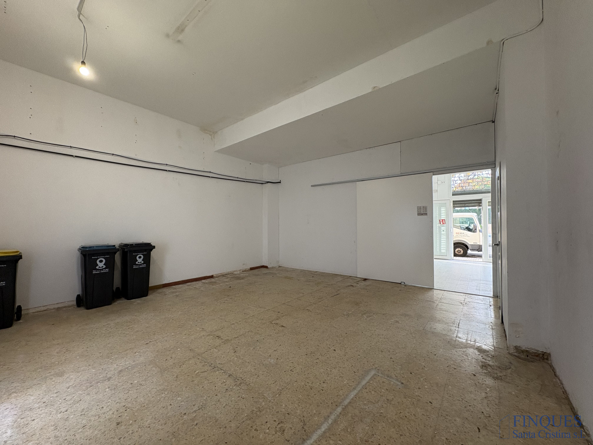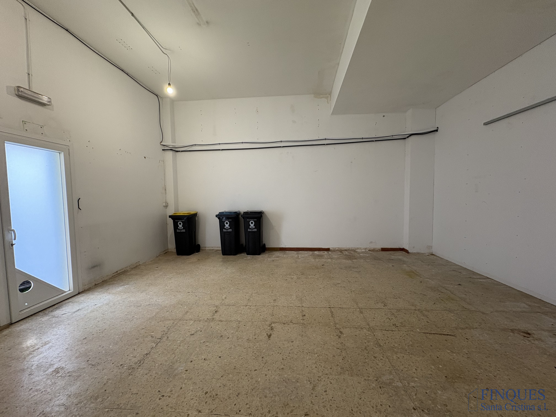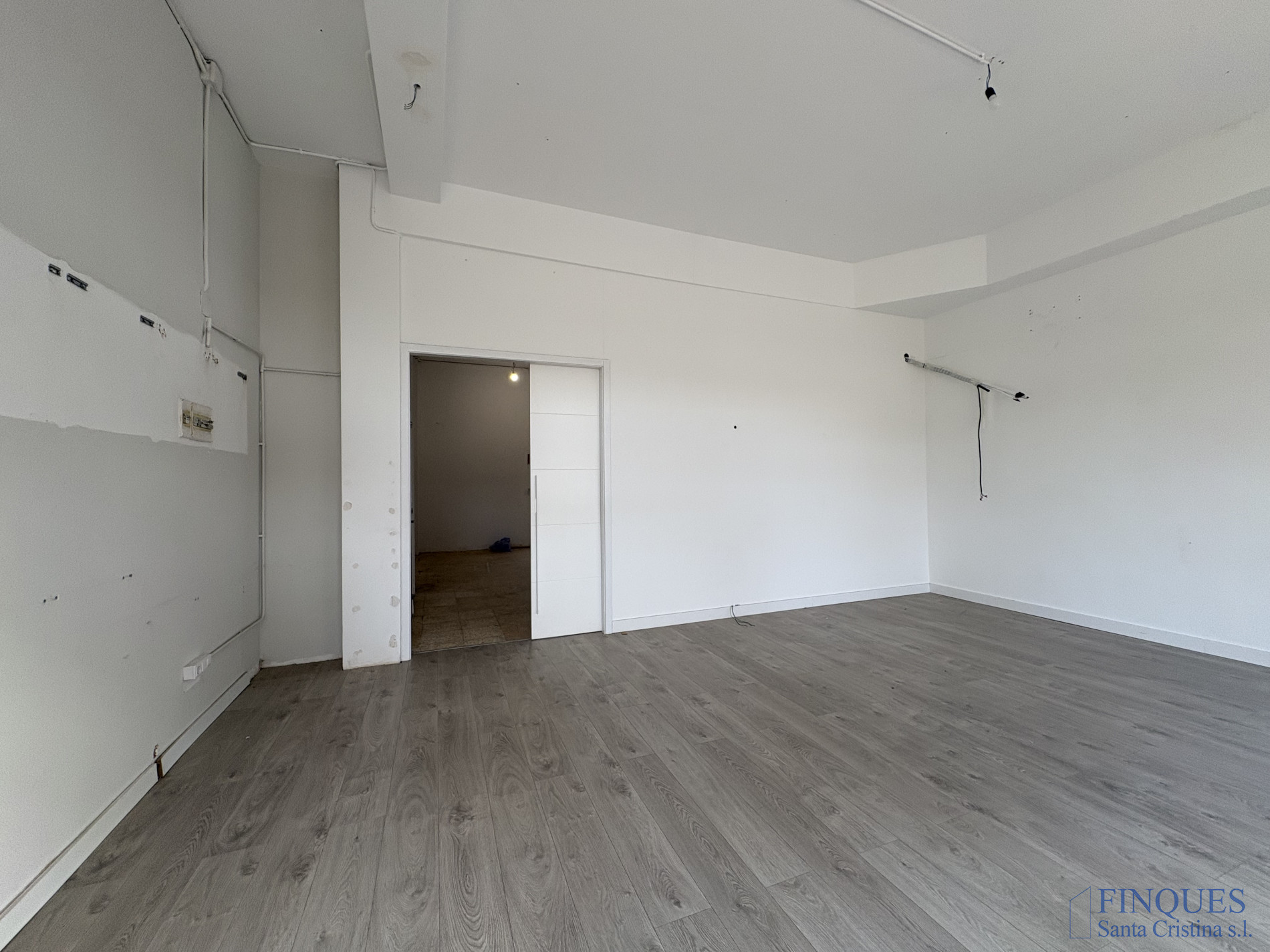 Santa Cristina d'Aro – Zone Centre. Grand local commercial. Ce local commercial dispose de deux grandes salles ouvertes. La première, avec parquet flottant, offre un accès direct depuis la rue et possède une double vitrine en verre qui assure une grande visibilité. On accède à la seconde salle par une porte coulissante, elle comprend un sol en grès, une salle de bains et une sortie vers l’arrière du bâtiment. Un espace idéal pour les entreprises nécessitant des zones vastes et polyvalentes pour développer leur activité.