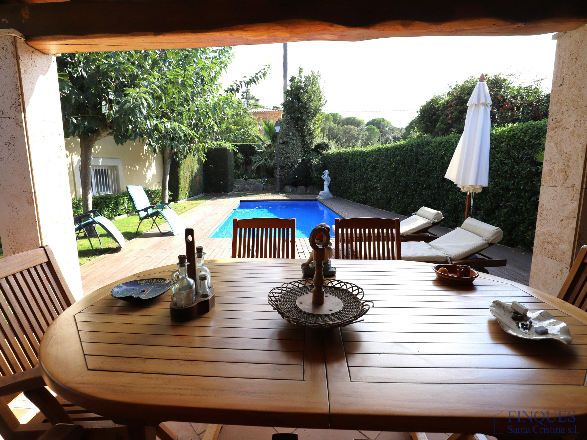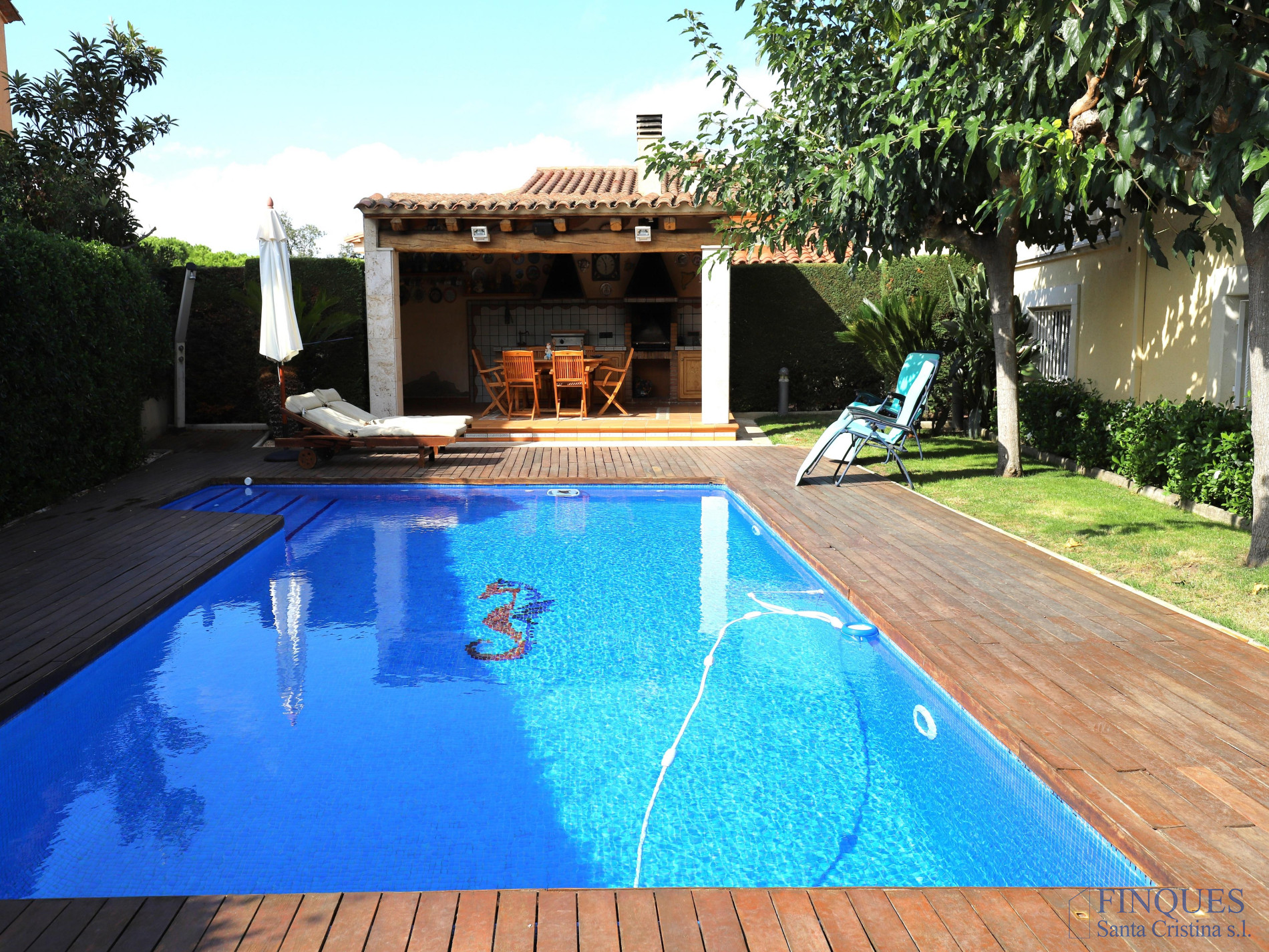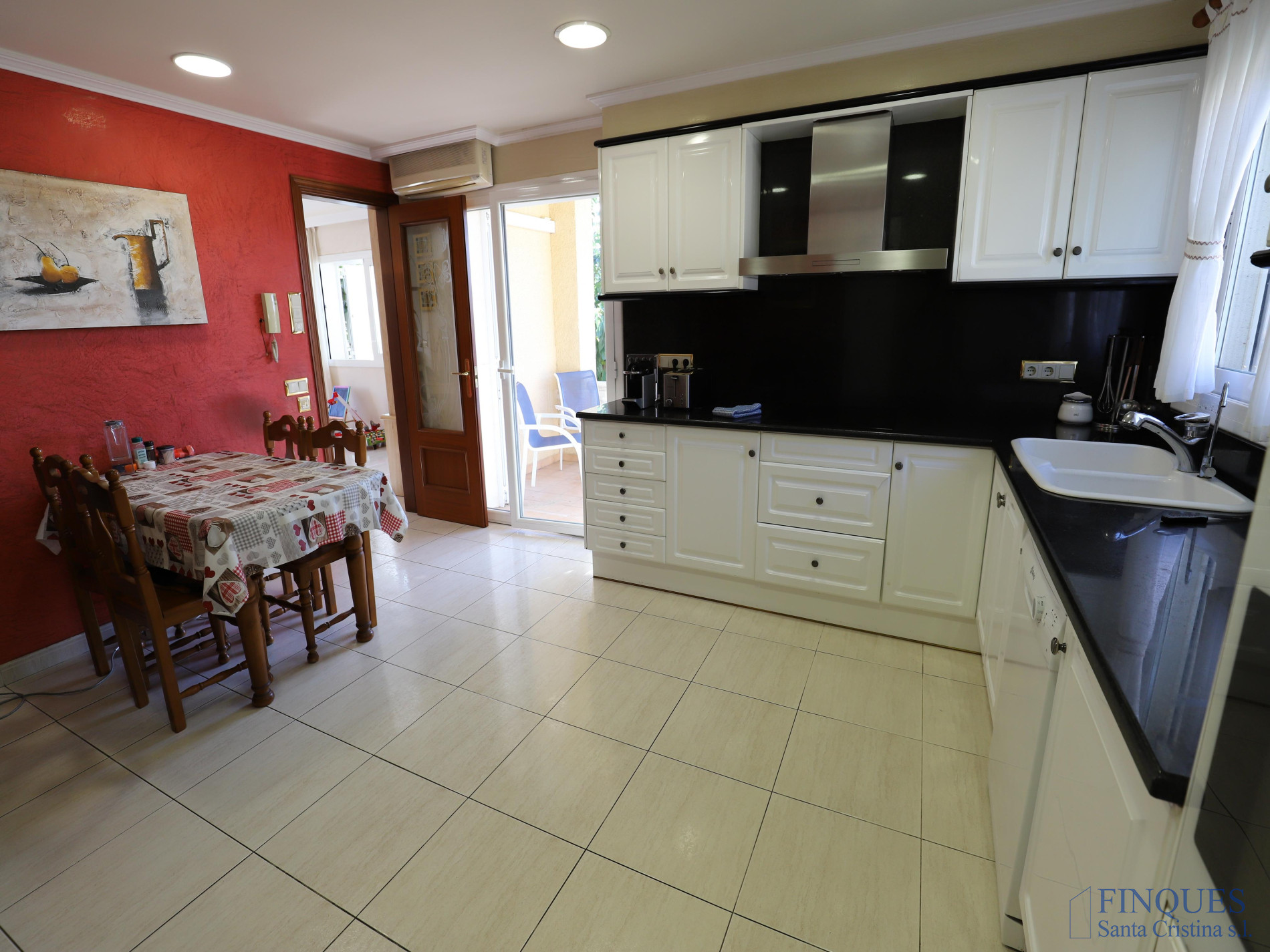 Santa Cristina d’Aro – Urbanización Mas Trempat. Casa toda en una sola planta principal, con planta sótano comunicada mediante escalera interior. La planta baja se distribuye en un amplio porche que da acceso al recibidor, salón-comedor y cocina independiente totalmente equipada, con chimenea y salida a un balcón y a la zona de lavandería. Dispone de cuatro habitaciones dobles, una de ellas tipo suite con vestidor y baño completo con bañera y ducha de hidromasaje, además de un segundo baño completo. En el exterior encontramos un jardín con piscina, porche con cocina de verano y barbacoa, y en la parte posterior, una zona habilitada como trastero. La planta sótano cuenta con un amplio garaje, sala de máquinas y baño completo. La vivienda está equipada con cierres de aluminio, calefacción de gasoil por suelo radiante y aire acondicionado mediante splits.