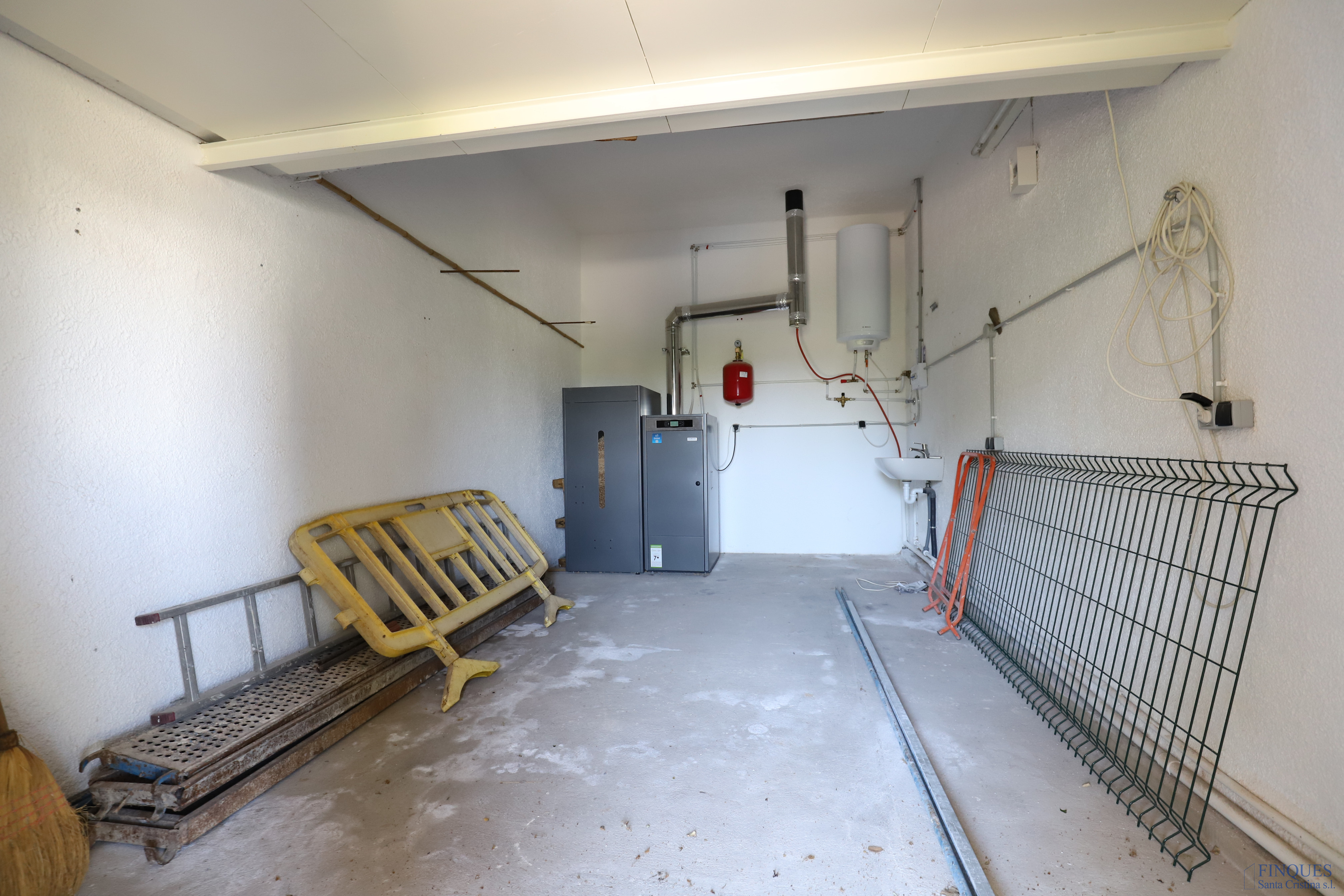 En la planta baja hay un garaje cerrado para un coche, donde también se encuentra la maquinaria de la caldera de pellets.