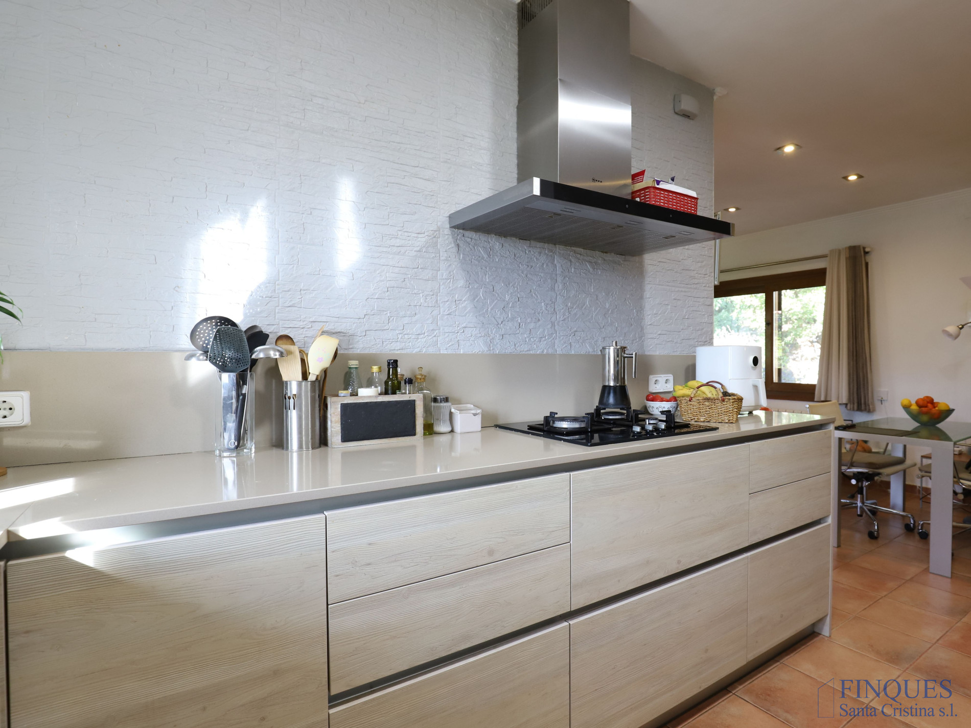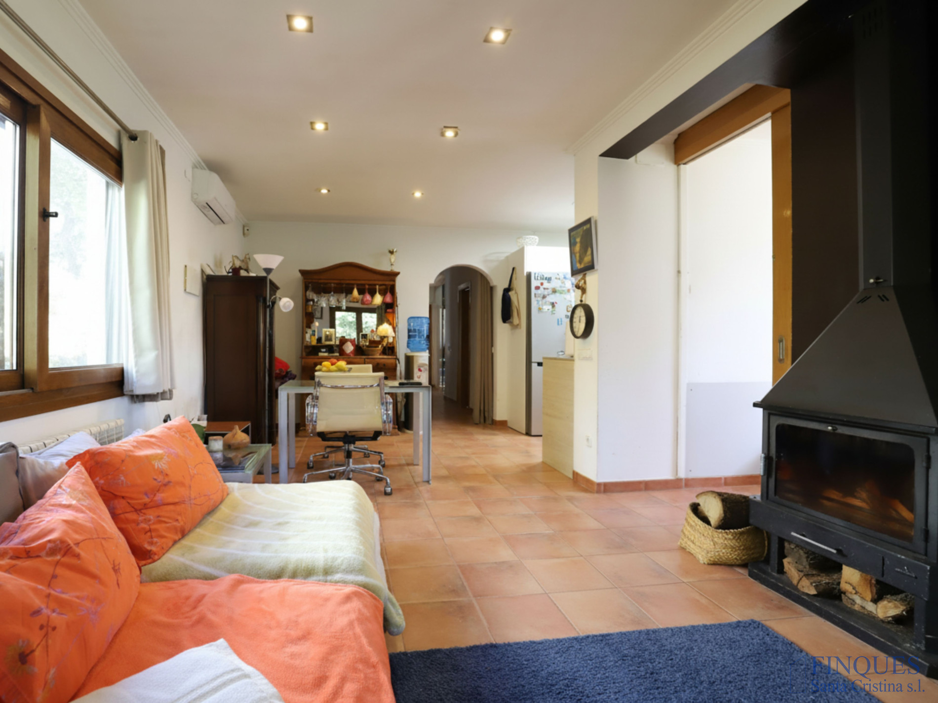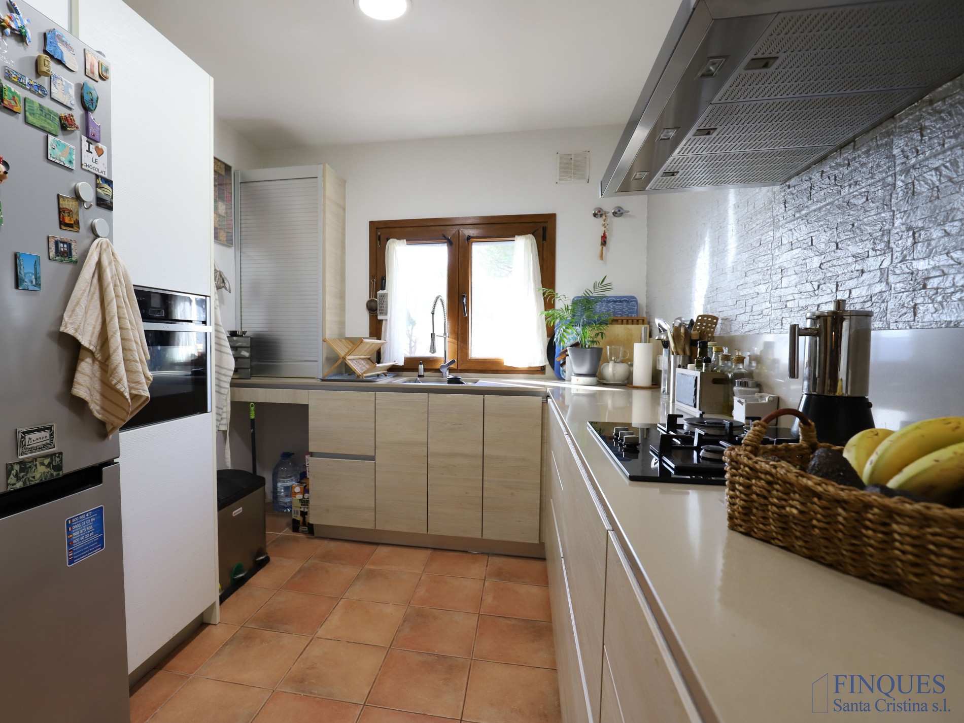 Santa Cristina d’Aro – Urbanisation Sant Miquel d’Aro. Maison individuelle exposée sur les quatre côtés, située dans un quartier résidentiel calme, sur une grande parcelle paysagée de 1 526 m². Elle dispose de trois accès : deux entrées piétonnes depuis la partie basse de la propriété et une entrée pour véhicules depuis la partie haute, donnant accès à un garage de 57 m². La maison est de plain-pied et comprend un hall d’entrée, un salon-salle à manger avec cheminée et cuisine ouverte, un couloir distributeur, trois chambres, un dressing et deux salles de bains complètes. Équipée du chauffage au gaz, de la climatisation par splits avec pompe à chaud et à froid, et de menuiseries à double vitrage.